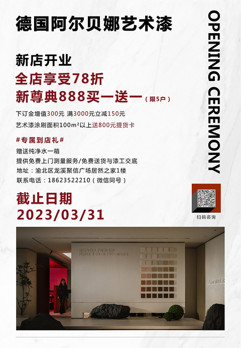 走过路过别错过!德国百年品牌阿尔贝娜艺术漆 开业钜惠,全店享78折新尊典888买一送一(限五户) 倾情邀请,等你来约惠! 想要了解或者需要的可扫码了解哦!