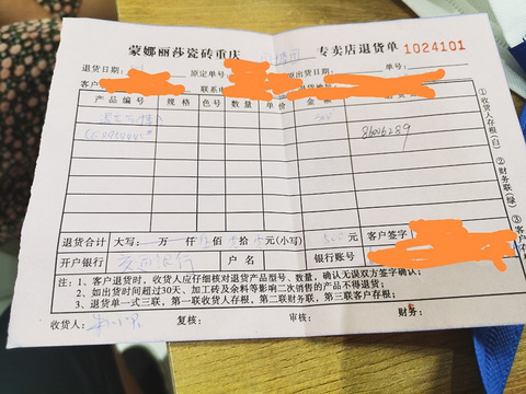 新房装修一直很顺利,谁知道遇到的第一件奇葩事是在瓷砖上,发个帖就是希望大家避一避坑,在考虑瓷砖的时候交订金还是要慎重!遇到蒙娜丽莎这个品牌,能躲多远就多玩!简单讲下事情经过,本人打算今年装修新房,于是在今年3月参加论坛的组织的家博会,逛的时候,发现蒙娜丽莎在搞所谓的交订金锁价格的活动,想到反正要装修,就交了五百元的订金锁定了几款砖的价格,销售当时承诺订金随时可退,而且可以在全市任意门店退款。到了