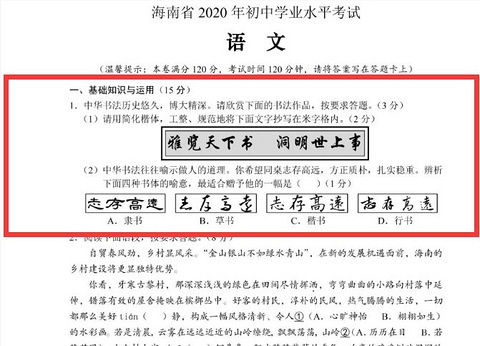 这个关于书法没人讨论吗,一个被忽视的小细节,书法也是现在考试中的一项了,2020年中考很多地区考到了书法。 海南省2020年中考第一大题,用15分的分值考查学生的写字能力和书法知识。2020南京中考考题,让学生选择两份书法作品中的一份临写,平时没有练过书法的学生,恐怕遇到这题没办法得满分!北京,2020年中考语文第一题,同样留给了书法!将书法纳入中高考还真的不是一句空话,多个省份已经切切实实地在行