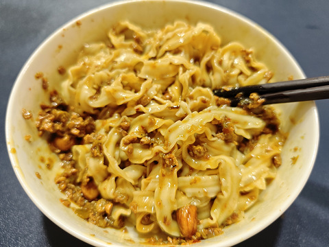 依然是有你一面出品的6份59.9,单份10块网上这款面评价都比较好面条跟之前牛肉面一样是宽面,口感不错牛肉粒虽然没广告图里那么大,但是给的量挺多烧椒用的川娃子的烧椒酱,味道是挺好吃的,就是稍微干了点,辣度很低,不会很油