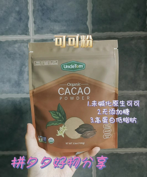 喜欢吃可可又不想长胖的我,在做了很多攻略以后选择了Uncle Tom这款可可粉,配料表上的脂肪含量相比其他几个牌子更低,而且是生可可粉所以热量也更低,营养更高。 这款生可可是不能直接冲泡的,味道很苦,除非做酸奶杯和咖啡面上撒很少一点是可以直接食用。 我是买的100g的,拿到手里很小一包,但是完全够用了,如果不是长期做烘培的,像我这样日常做下酸奶杯和可可牛奶之类的,买这种份量的完全合适了,因为每次