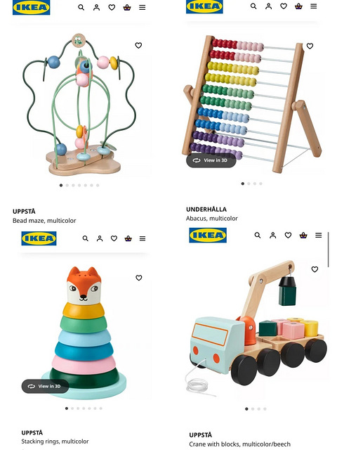 以前逛宜家从来不会注意儿童区,所以都没有发现宜家有这么多宝藏的实木小玩具! 其中最强推的就是这个绕珠玩具,娃从两个多月玩到九个多月,现在每天依然还会玩个10几分钟!两个多月的时候是大人把珠子拨来拨去,因为有声音,小娃会好奇的抬头看,用来练抬头。等娃稍微大一点就会趴在爬爬垫上,开始自己上手去扒拉,到后来会越来越熟练,锻炼手指灵活度! 还很推荐蔬菜蓝,虽然不是木制玩具,但是最近超级喜欢蔬菜蓝里面的