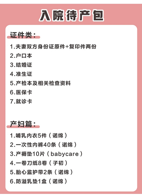 看到市妇幼公众号发的,有准备在市妇幼生娃的快看看。入院物品准备:为了让准妈妈们入院时可以更加淡定从容,准爸爸们请提前帮准妈妈们把入院物品准备好。入院物品可以选择集中放置在一个大包里,当出现紧急情况时,便于快速出发。入院物品准备证件准备:身份证、医保卡、《母子健康手册》及产前检查的所有化验单、B超、心电图报告单、有效期内的核酸检查结果等。如需医保报销,请带上准生证、生育证明等。