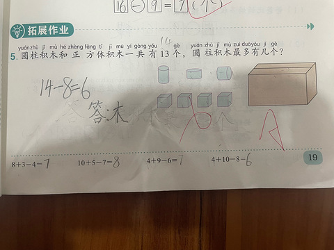 这个题,真心没有看懂,是数积木数量吗,3个圆积木,4个正方体积木,一共7个。13-7=6,一共圆积木最大就9个呀,但是答案是错误的。这个怎么解哟,论坛的宝妈宝爸,老师们