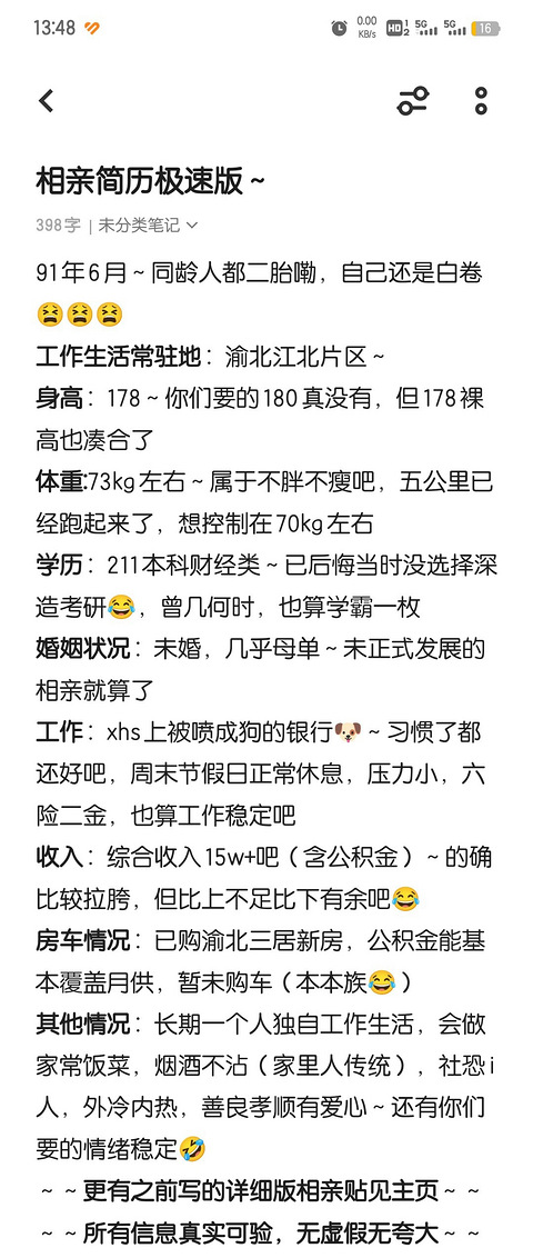 基本情况:1.独生子女,91年,裸身高174,体重130+,211本科,未婚未孕,不像狮子座的狮子座,坐标渝北大竹林附近,一个人住。2.Top10开发商工作,非销售岗,双休3.爸妈退休了,有退休金,他们住巴南。不妈宝,主见比较强,像选学校选专业,工作买房这些事儿都是自己做决定。4.性格不好说,可以很正经,也可以很逗比,有时候还很蠢比,能开玩笑能接梗。一个人过惯了,生活技能点满,文能弄几个拿手炒菜,