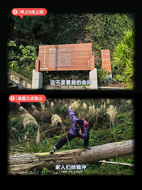 状元碑轻轨站集合,走到歇马街道结束,再坐车回状元碑那片云那片山,全程15公里多,爬升600多,整体难度适合大多数人群开始走一截城市道路,然后进山开始爬升,整个爬升基本在第一段,会有点累到顶后可以看下风景休息下,中间比较平缓,有一些路被树木遮挡了,需要野穿过去好耍,过独木桥,各显十八般武艺下山阶段,注意防滑,会路过一点壁壁,这个壁壁爬着舒服今年爬了一年山,每周一没断过,也快准备今年快乐户外爬山年终