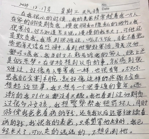“时隔两年,我意识到为女儿讨回公道,远比守护所谓的名声重要。疑犯不能绳之以法,是对女儿最大的伤害。”陈海说,女儿被亲戚猥亵后,他下定决心,要为孩子讨个说法。 女儿陈丹在日记中写道,“不知不觉我自己会割手腕,就好像这样的疼痛不会在(再)想起这些事。我也看到过他欺负过很多小女孩,我想警察帮我惩罚坏人。” 留守女孩称身体不舒服向父母提去医院检查父母询问老人,得知孩子遭亲戚猥亵 1990年出生的陈海家住江