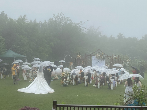 #户外婚礼 户外婚礼大部分新人会担心的就是天气因素??????,但其实只要是喜欢草坪婚礼的新人,即使是这种淅淅沥沥的小雨天气,也别有一番风味,带着云雾缭绕,坐落在倾城之巅,那一抹绿色,是无限的生机和朝气