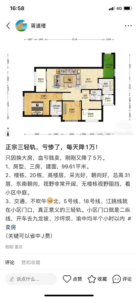只因换大房,血亏贱卖,刚刚又降了5万。房型,三房,建面,99.61平米。楼栋,20栋,高楼层,采光好,朝向好,总高31层,东南朝向,视野非常开阔,无楼栋视野阻挡,看小区中庭。交通,不吹牛[ej=1F31E]北,5号线、18号线、江跳线就在小区门口,真正意义的三轻轨。小区门口就是二纵线,开车去九龙坡、沙坪坝、渝中均半个小时以内。 (关键可以省中J费)