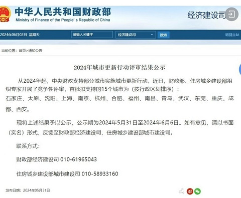 财政部官网发布2024年城市更新行动评审结果公示首批拟支持15个城市实施城市更新行动重庆、成都入选其中 首批拟支持的15个城市为(按行政区划排序): 石家庄、太原、沈阳、上海、南京、杭州、合肥、福州、南昌、青岛、武汉、东莞、重庆、成都、西安。 资金支持方向具体包括: 城市地下管网更新改造。对城市燃气、热力、给排水、电力等城市地下管网实施更新改造,因地制宜推进城市地下综合管廊建设,提升城市地下管网