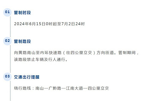因南岸区向黄路X匝道桥主梁病害治理施工,自2024年6月15日起,对道路交通组织进行相应调整,相关措施如下:01 管制时段 2024年6月15日0时起至7月2日24时 02 管制路段 向黄路南山至内环快速路(往四公里立交)方向匝道。管制期间,该路段禁止车辆及行人通行。 03 交通出行提醒 绕行路线:南山—广黔路—江南大道—四公里立交 温馨提醒因整治区域存在安全隐患,非施工作业人员强行通行或闯入施工