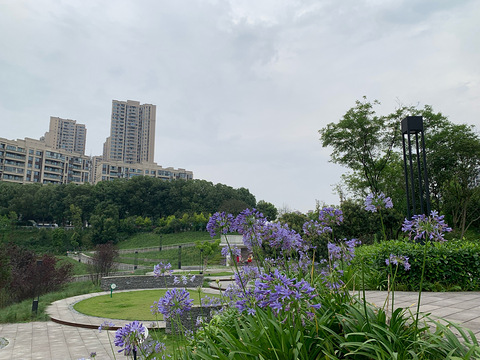 大竹林天元道和新江与城中间的公园叫跳墩河公园,和康庄那边看美人梅花海的是一条河,那边叫做跳墩河公园百塘园。相比之下,这里更为清净,没有钓鱼的,游客也少,设计和市政维护还不错,现在盛开着百子莲。