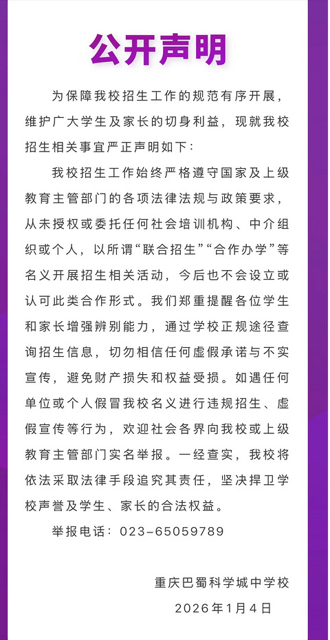重庆巴蜀科学城中学校公开声明没有委托外面的机构招生