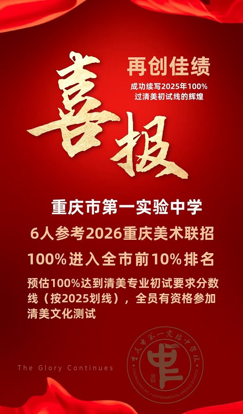 2026届重庆美术联招成绩刚刚出炉,重庆市第一实验中学就交出了一份令人惊叹的答卷! 今年全校6位美术生参考,再次展现了惊人的实力: 100%全员进入全市前10%排名 预估100%达到清华美院专业初试要求分数线 全员获得参加清美文化测试资格这是继2025年创下100%过清美初试线的辉煌后,重庆一实再次成功续写传奇!