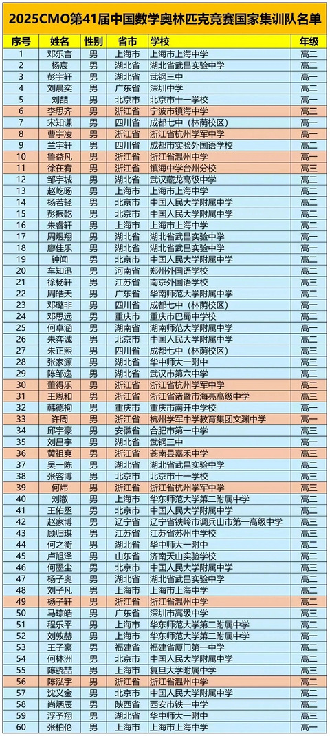2025年第41届数学竞赛决赛CMO国家集训队名单出炉