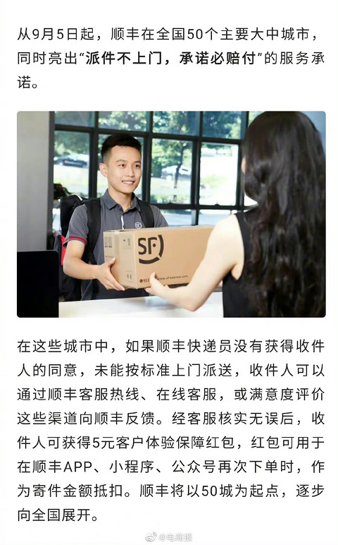 顺丰在全国50个城市,承诺派件不上门必赔付。若未经允许没有上门派送,顺丰将赔付5元客户红包,可用于在顺丰寄件时,当优惠金抵扣