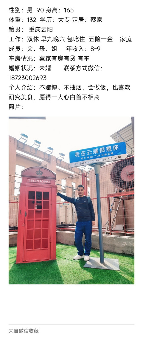 出生年月:1993年-10月身高:174体重:66公斤左右学历:大专居住地/籍贯:渝北/四川广安车/房情况:渝北汽博 有房有车婚姻状况:未婚工作/收入:汽车新能源充电站/1万左右家庭成员:原生家庭,有姐姐已婚 个人介绍:不抽烟,不主动喝酒,不主动打麻将,没学打游戏,社交圈简单;居家顾家型,会做饭,可以包揽家里大事小事 择偶要求:160以上,无不良嗜好,无纹身,通情达理,会做饭-只需会一点点,不在乎