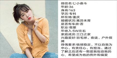 年龄:34籍贯:重庆(老家垫江来主城20来年)常活动地域:茶园、杨家坪学历:大专身高:172婚姻:未婚未育职业:砂石料贸易(销售类)收入:反正去年15左右、今年不晓得。月薪稳定,至于多少看业绩爱好:自己弄各种吃的 话语不多,需要人带话题。在自己熟悉的领域到也能畅所欲言,不然也不能干销售行业。抽烟喝酒打牌都会,但量都不大。有破车一辆、瓦房一间。 对于你我希望你是个话包子,可以和我分享你一天生活的琐碎