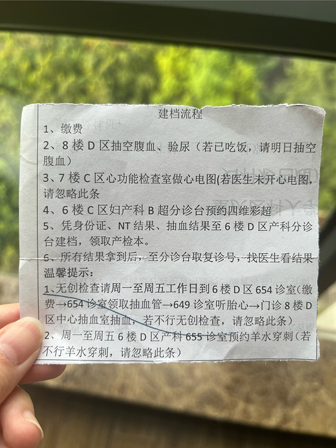 挂号:如果对时间有要求,一定要提前【至少两个星期】挂!我是有孕反的,吃饭太晚会一直干呕,很难受,结果提前一个星期多挂号,都只有11点的了。如果有姐妹和我一样挂的号靠后,请早于8点前到医院。当天我7:40就到了,挂的周虹医生的号,医生会早于8点到诊室,你可以直接去找医生,表明自己今天是来建档的,医生会把nt单子给你开好。我当时开完单子出来还没有8点,没有耽误正常挂号姐妹看诊的时间。 nt检查: 拿着