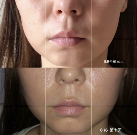 6.7号打了国产衡力的V脸套餐,瘦脸针加下颌线,我自己感觉咬肌不大,就是肉多和骨头,可面诊的医生说我合适打瘦脸针,两边扎了很多个针眼,右边咬肌大一点扎的多几针,医生说我有点面颊缺陷所以帮我往下面打了些。前面几天拍了照感觉看不出什么变化,这几天就没拍照,今天半夜忽然想起来,第十天了,用闪光灯拍了一下,大家帮我看看是不是一点变化都没有,不知道一个月后会不会小一点。