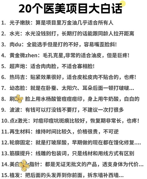 今天分享一篇超简明的合集这里囊括了市面上大热的项目,每条话都言简意赅,适合所有小白姐妹快速了解 但在开始之前,姐妹们一定要记住:选择医美项目时千万别草率!找到最适合自己的才是最重要的。有些人因为不了解自身需求,结果在不合适的年纪做了错误的项目,比如20岁就去做超某炮、热某吉!这些项目我都是29岁后才开始考虑的,30岁才去做。还有那些尝试线吊、大la皮的姐妹们,真是让人又敬佩又心疼
