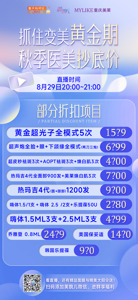 逆转时光美丽翻倍爱不打样安心守护留住青春留住美 美貌儿秋季医美直播即将来袭8月29日20:00~21:00抗衰怎么做?项目怎么选?到底要买几支才有效?姐妹们你们的担心我们都了解本次直播我们将为您提供专业的解答和帮助观看时还可以实时互动,零距离获得指导爱纠结爱内耗的姐妹们也不用担心选错项目啦!另外,参与直播还有惊喜好礼可以抽取哟~赶紧扫码添加美貌小姐姐微信报名吧!