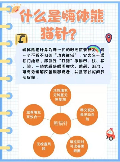 应各位姐妹们的要求,我去巴拉来了一些关于嗨体熊猫针的科普小知识,希望对大家有用啦~ 而新晋网红“嗨体熊猫针”就是去黑眼圈不错的选择,已经获批Ⅲ类医疗器械复配型注射产品的它,物如其名,是像熊猫一样珍贵的存在。 嗨体熊猫针是新一代的眼周抗衰新品,在对付眼周皮肤的问题上,堪称“功夫熊猫”,不仅能轻松“打跑”眼周凹、纹、松、皱,还能一站式解决眼周细纹、眼袋、泪沟,并缓解、改善眼部衰老的情况,长时间养润眼周