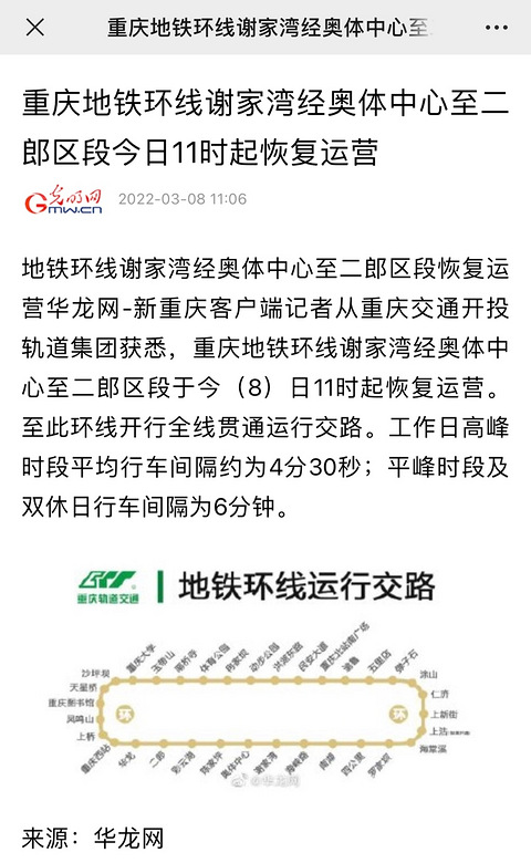 地铁环线谢家湾经奥体中心至二郎区段恢复运营华龙网-新重庆客户端记者从重庆交通开投轨道集团获悉,重庆地铁环线谢家湾经奥体中心至二郎区段于今(8)日11时起恢复运营。至此环线开行全线贯通运行交路。工作日高峰时段平均行车间隔约为4分30秒;平峰时段及双休日行车间隔为6分钟。