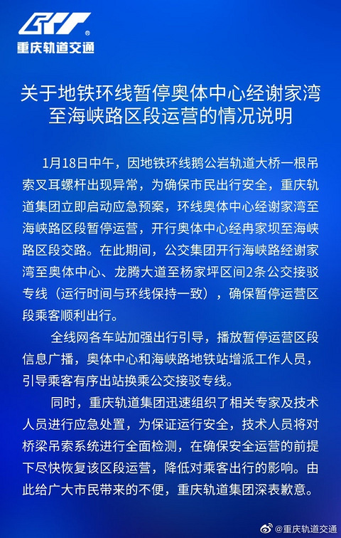 看轨道集团发的通告,鹅公岩轨道专用桥上,一个用于连接吊索和桥身的连接件发现安全隐患(脱落?移位?裂纹?),导致这个区间内的环线停运;多灾多难的环线呀!