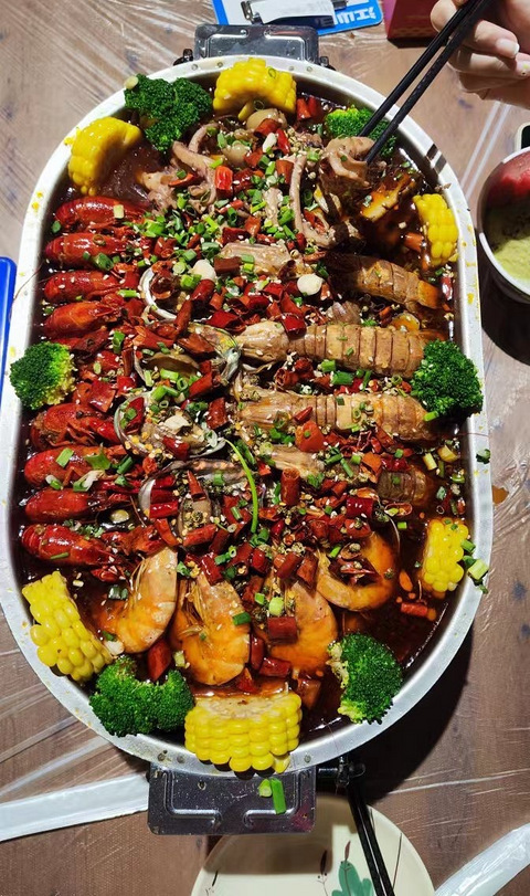99块钱这一份海鲜拼盘,味道很不错!有基围虾,小龙虾,鱿鱼,鲍鱼,墨鱼仔,还有些贝壳类,素菜,种类比较多~还有两个扇贝,两个生蚝,烤的~都是套餐里的!