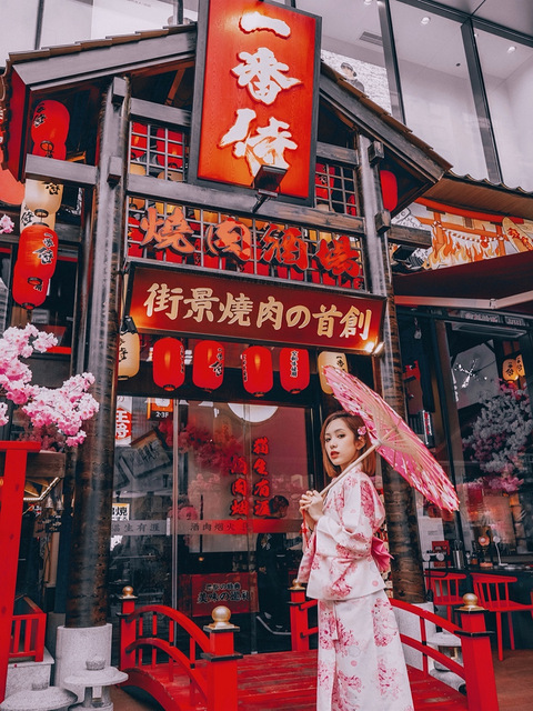 金沙天街这家沉浸式街景烤肉店太绝了居然把一整个京都街景复刻到了店里。不管是门口的樱花小径,还是店内的招牌街景、居酒屋,都是相当出片的。店里免费提供换装,一整套配饰(发簪、纸伞、面具),还有补光灯,就算是新手也能拍出美美的照片 不用担心去晚了没有好看的服装,这几套都是老板经过精心搭配的,我们试了好几套都没有翻车~烤肉店: #一番侍烧肉酒场(金沙天街店)[地点]#金沙天街店:沙坪坝金沙天街B馆1楼29