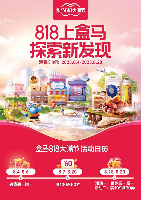 这么热的天,就适合在家看手机逛逛朋友圈。刚看见朋友圈爱融荟城盒马鲜生在搞818活动,买一送一还有满减活动。平时也喜欢逛逛这些超市,看看买买,今天看到这个活动,感觉力度也还可以,明天就是818时间也赶的巧,周六,可以和屋头的人去逛哈。那个酸奶和肉,家里常吃的可以买一赠一囤一点,还可以,不知道还有什么,明天去逛逛看。
