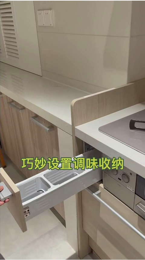 在小红书上看见日本橱柜灶旁边有调味小拉篮的配件,因为我设计的柜体宽度正好是90cm灶体60cm,灶两边正好有15cm的空间如果不利于起来又觉得浪费,但是国内也找不到日本这种小抽屉的配件 最后在安装前我灵机一想淘宝找了15cm的双层拉篮然后切割了不知道能不能装,最后安装师傅非常耐心的和设计师通话沟通又补了板帮我装好了,真是太感谢力诚的设计师和安装师傅非常有耐心的帮我解决问题。