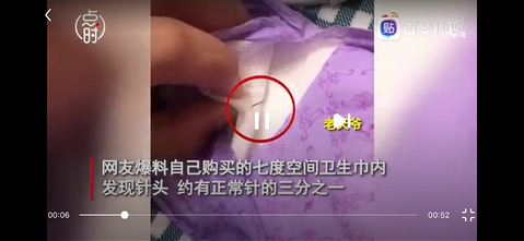 细思极恐!七度空间卫生巾里发现一根针头,还好没有用哦,这要是居进去了不晓得好恼火啊。