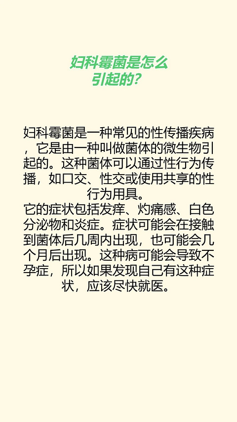 妇科霉菌是怎么引起的?妇科霉菌是一种常见的性传播疾病,它是由一种叫做菌体的微生物引起的。这种菌体可以通过性行为传播,如口交、性交或使用共享的性行为用具。它的症状包括发痒、灼痛感、白色分泌物和炎症。症状可能会在接触到菌体后几周内出现,也可能会几个月后出现。这种病可能会导致不孕症,所以如果发现自己有这种症状,应该尽快就医。治疗可以通过药物治疗来实现,包括抗生素和抗真菌药物。这些药物可以消灭菌体,从而消