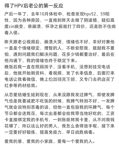 网友记录自己发现HPV阳性,自己打了四价还是被病毒入侵,很崩溃。但是她老公一直在安慰,鼓励她,让她有了勇气。