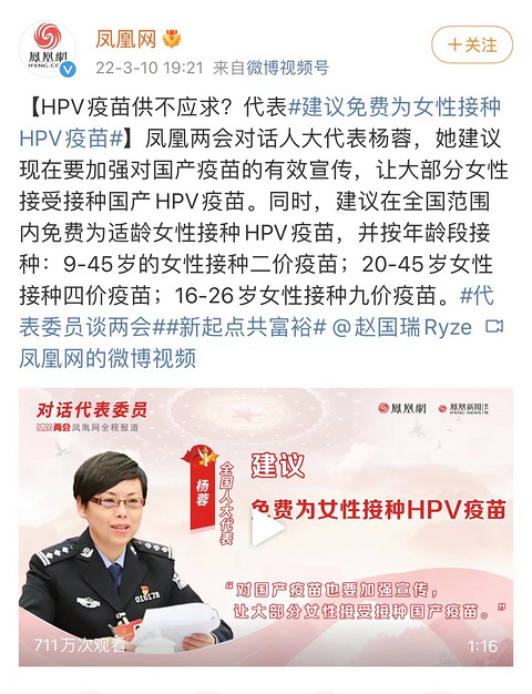 这个建议好,HPV疫苗真的太难约了。 【HPV疫苗供不应求?代表#建议免费为女性接种HPV疫苗#】凤凰两会对话人大代表杨蓉,她建议现在要加强对国产疫苗的有效宣传,让大部分女性接受接种国产HPV疫苗。同时,建议在全国范围内免费为适龄女性接种HPV疫苗,并按年龄段接种:9-45岁的女性接种二价疫苗;20-45岁女性接种四价疫苗;16-26岁女性接种九价疫苗。
