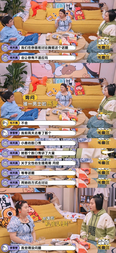 很喜欢这一期的毛雪汪,杨天真的输出一如既往的令人受益匪浅。在聊天中,李雪琴向杨天真表示自己有很严重的驼背,因为小时候发育比较早感觉自卑,所以总是含着胸。杨天真向一旁坐着的毛不易询问,在他面前讨论这类女性话题,是否会有不适感?毛不易说并不会。杨天真便提到自己最近去看了小鹿的脱口秀,演出时讲了大量关于女性生理周期、月经的话题,现场很多男性观众都表现出了尴尬和不适。月经并不是羞耻,它只是一个正常的生理现