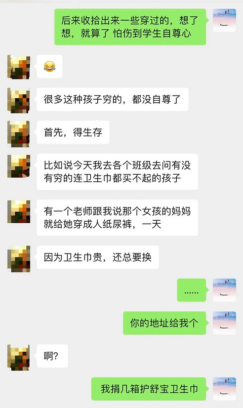 认识两个内蒙的特教老师,有次在群里聊天,她问她自己囤的卫生巾捐给学生合适吗?她说学校有些女生用不起卫生巾,就用一天成人纸尿裤;还有些女生因为身体原因,自理能力不行,厕所里一地血,跟凶杀现场一样……我还以为现在社会了,卫生巾便宜的3块钱多钱,都能用的上了,原来还有那么多人不能“姨妈巾自由”。