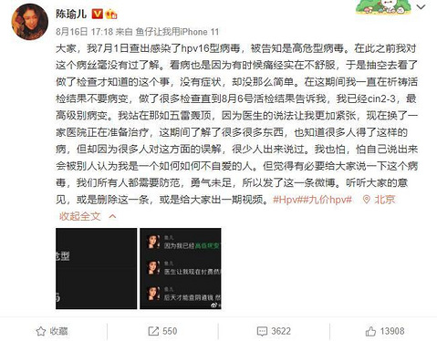 不久前,一网红博主发布微博,坦诚自己感染了HPV16型病毒。她表示,自己对HPV完全不了解,因为痛经去看病才偶然发现。虽然没有症状,但做完活检结果后医生告诉她,已经出现cin2-3,最高级别病变。一开始,她很惊慌,以为自己染上不干净的东西,直到对HPV有所了解,她才有勇气发出来,提醒更多女生注意。 结果,微博发出后,引起很多网友的讨论。甚至有人指指点点,恶意揣测……感觉论坛也有挺多人关注HPV的,