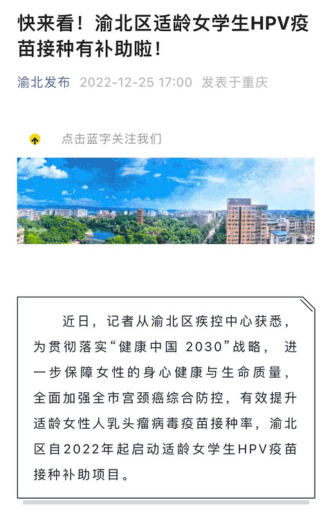 近日,记者从渝北区疾控中心获悉,为贯彻落实“健康中国 2030”战略, 进一步保障女性的身心健康与生命质量, 全面加强全市宫颈癌综合防控,有效提升适龄女性人乳头瘤病毒疫苗接种率,渝北区自2022年起启动适龄女学生HPV疫苗接种补助项目。