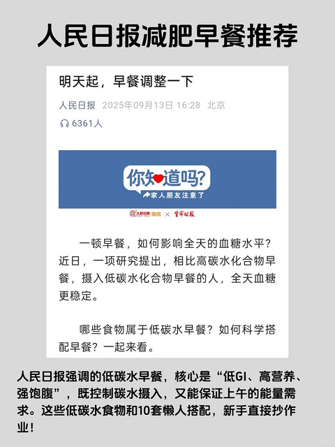 跟着人民日报吃早餐准没错! 低碳水早餐不仅稳血糖、抗饿4小时,还能帮身体少囤脂肪,整理了超全的「低碳水食材清单」和「懒人搭配公式」,新手直接抄作业!