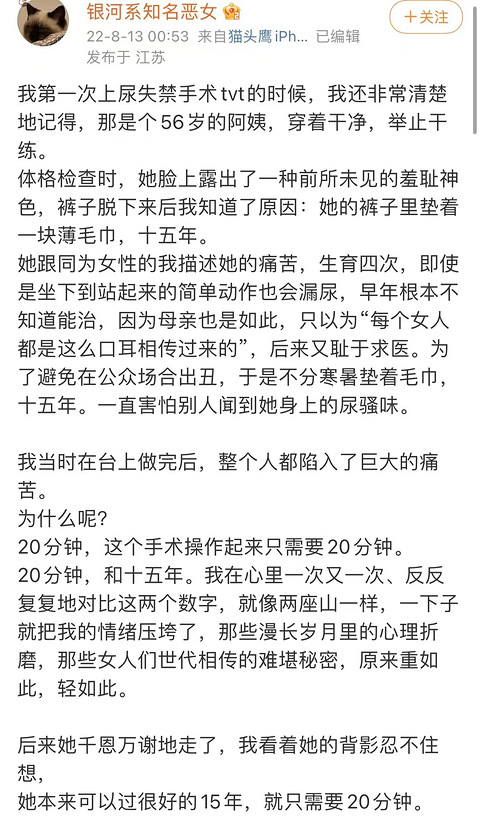 刷微博看到这个,看了觉得很痛苦 。老一辈对于妇科病的难以启齿,让自己受了好多罪。 一位尿失禁15年的阿姨: