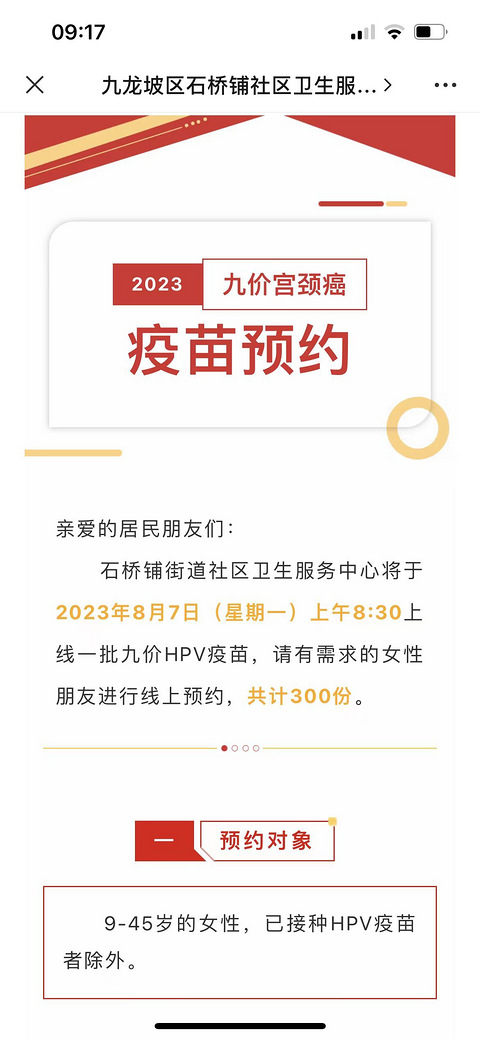 石桥铺街道社区卫生服务中心8月7日有扩龄九价HPV疫苗,快约!有300份,感觉应该还是比较好抢。8月7日上午8:30,大家把闹钟告起哦。