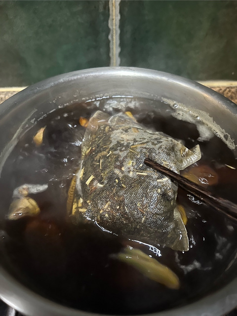 一天一块钱的养生来了!庆德堂买的泡脚包,30多块钱,具体30多好多我记不得了,一包有30包。 泡脚包和姜一起先熬20分钟,把药味先熬出来,很浓郁。