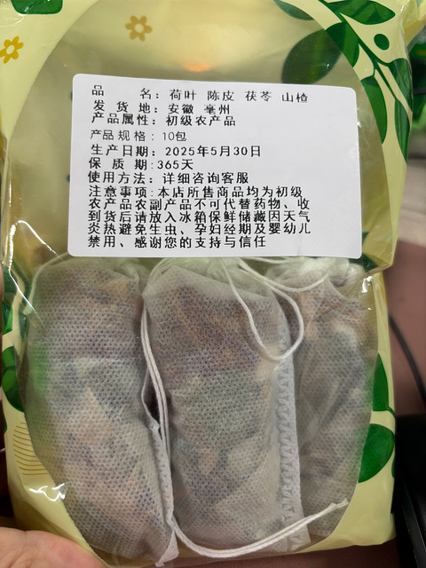 我去看中医说湿气重,我就去网上买了祛湿茶包来煮着喝,没想到……说是陈皮茯苓山楂荷叶,其实陈皮就是橘子皮,一煮出来就是新鲜橘子皮……茯苓在一包里面就两颗山楂就五六片荷叶最多了……所以说要买类似祛湿的茶包还是去药房买中药饮片,毕竟品质还是相对有保障!药材看得到!我买的这种属于是农副产品,全凭良心了,不是我拆开,真没注意到……所以像我这种小白还是线下药房买吧……