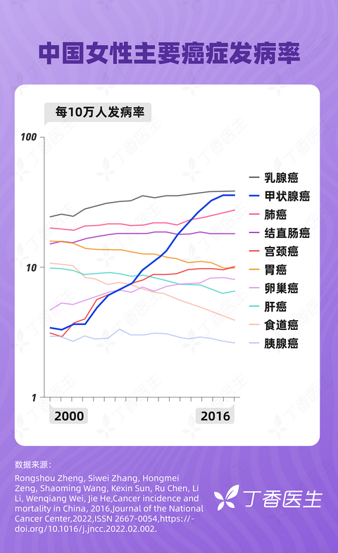 丁香医生 癌症是人类健康的老对手。一方面,我们在努力找出癌症的病因,试图预防减少癌症风险;另一方面,平均寿命不断攀升,老龄化也让癌症更多发生。 博弈的结果就是大部分癌症在最近的几十年里发病率基本平稳,只有少许的上升或者下降。 但,有一种癌症非常特别。它的发病率飙升,已经从 20 年前不起眼的癌症,变成了今天中国人,尤其是中国年轻女性的最大癌症。 这条显眼的蓝线,就是 20 年飙升了 20 倍的新锐