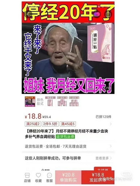 女娃儿最常见的问题就是月经不调,平常都是去看中医这些撒。最近看到拼夕夕上的这些治大姨妈的东西推荐,简直辣眼睛,10多快就能治好大姨妈,你敢信?有月经贴,暖宫贴,还有吃的阿胶糕,还有药,等等等等。好奇这些广告都是怎么过审的! 停经20年,贴个这玩意大姨妈就来了?