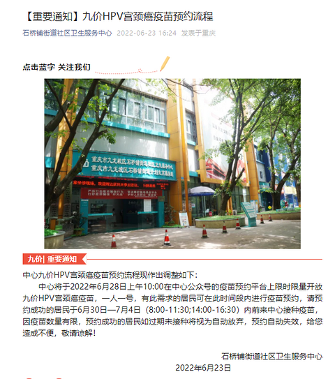 好消息!石桥铺街道社区卫生服务中心28日有200支九价HPV疫苗