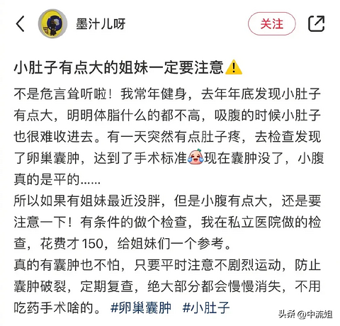 有小肚子的女孩要注意啦,可能不是纯粹的胖,定期体检的必要性。有姐妹查出了卵巢囊肿,要注意哦。